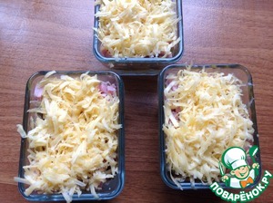Дальше вы выбираете либо порционные формочки, либо одну большую. Форму смазываем слегка растительным маслом и выкладываем рис, ложкой его приминаем и поливаем сверху рис соевым соусом. Далее выкладываем грибную начинку и сверху ветчину. Закрываем все натертым сыром. Ставим формочки в духовку при 180 гр на 10-15 мин до зарумянивания сыра.