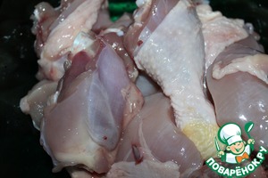 Берем курицу. Разрезаем на небольшие куски (крылья и хребет я не оставляла). Обмываем водой. Можно использовать не целую курицу, а отдельные части (голень, грудку, бедрышки)