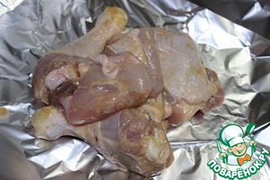 Выкладываем нашу курочку в фольгу (я использовала 3 слоя фольги, чтобы сок не вытек и курочка была сочной)