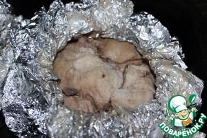 Заворачиваем курочку в фольгу трюфелькой. Края фольги должны быть вверху. Хорошо прижимаем фольгу.