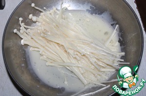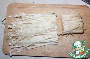 Еще один очень быстрый рецепт с китайского кулинарного портала. Для этого блюда нам понадобятся зимние опята. В Китае их называют цзиньчженьгу, в Японии энокитаке. В российских торговых сетях импортируемые культивируемые грибы иногда продаются под названием «иноки».