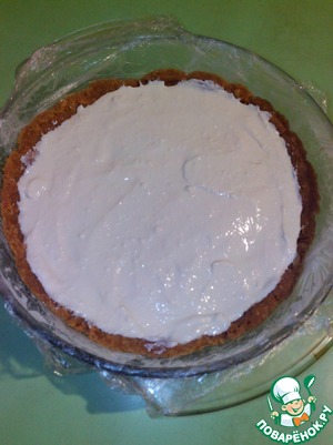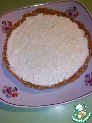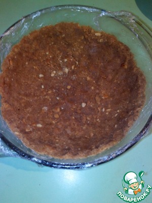 Для начала приготовить основу. Печенье измельчить в блендере в крошку и смешать с растопленным сливочным маслом. Форму (у меня стеклянная, диаметр 24) застелить пищевой пленкой и выложить основу, плотно прижимая, и сделать бортики примерно 4-5 см высотой. Убрать в холодильник.