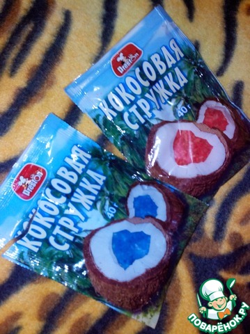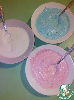 Разделить творожную массу на три равные части. В 1 добавить белую кокосовую стружку, во 2 - красную, в 3 - синюю.