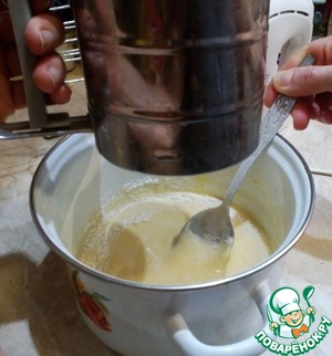 Оставшееся молоко разогреть и распустить в нем кофе и какао порошок, добавить по одному желтки.