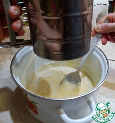 Приготовление бисквита. Духовку нагреваем до 200 град. Яйца растираем с сахаром в кремообразную массу.