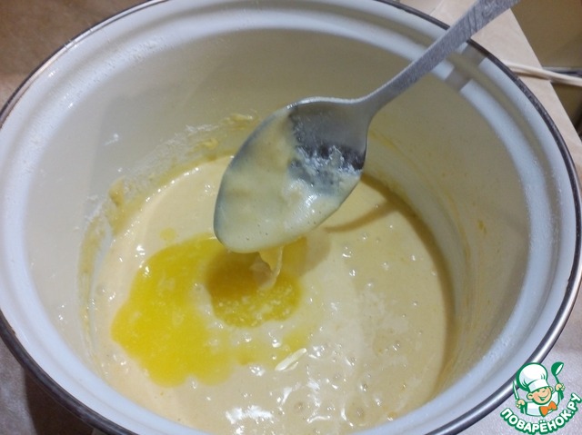 Растапливаем на водяной бане сливочное масло и постепенно вводим в массу. Дно разъемной формы выстилаем бумагой и выкладываем тесто. Выпекаем в разогретой духовке 20-25 минут, первые 15 минут не открываем! Готовность проверяем деревянной палочкой. Вынимаем бисквит, остужаем, снимаем бумагу и промазываем любой пропиткой. Возвращаем в разъемную форму.