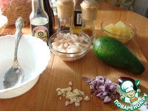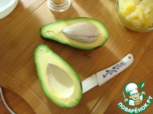 • Авокадо разрезала на половинки. очистила и полила лимонным соком. порезала небольшим кубиком, отправила в салатник. туда же отправила ананасы без жидкости.