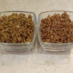 В обе смеси добавляем измельченный чеснок. Идеальным вариантом будет измельчение в каменной ступке. Я же таковой не имею, поэтому просто выдавила чеснок через пресс.