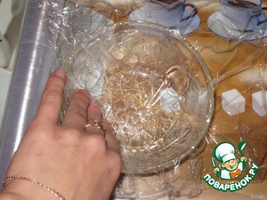 Я беру салатницу, прокладываю изнутри пищевой пленкой и немного смазываю растительным маслом пленку. Форму можно брать любую.