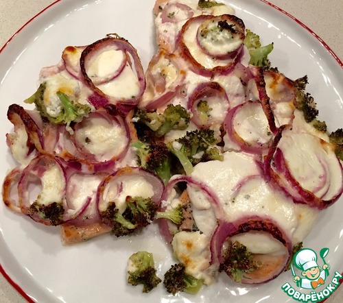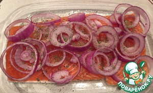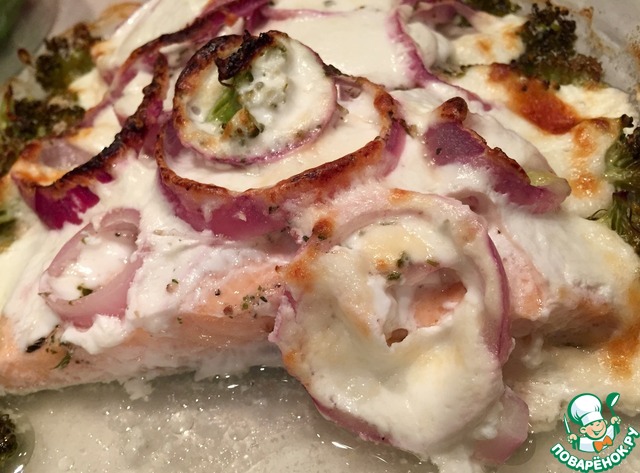 Рецепт «Сочный запечённый лосось в луковой шубе»: