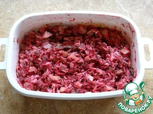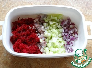 Свеклу натереть на терке, сельдь отделить от костей, нарезать кубиками, сельдерей и лук - кубиками