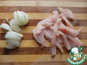 В сковороде разогреть масло и обжарить там грудку вместе с луком, до золотистого цвета.