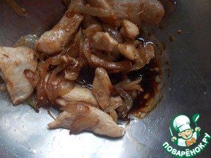 • Грудку порезать соломкой и лук также.
