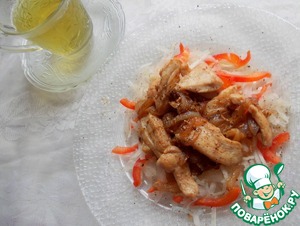 • Выкладываем на тарелку перемешанные дайкон с перцем, сверху горячую курочку с луком и соусом. Каждый сам у себя в тарелке перемешает.