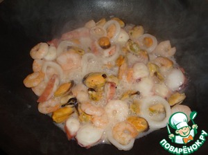 Морепродукты или рыбу обжарить несколько минут на сильно разогретой сковороде в небольшом количестве масла. После помойте сковороду, либо оботрите салфеткой.