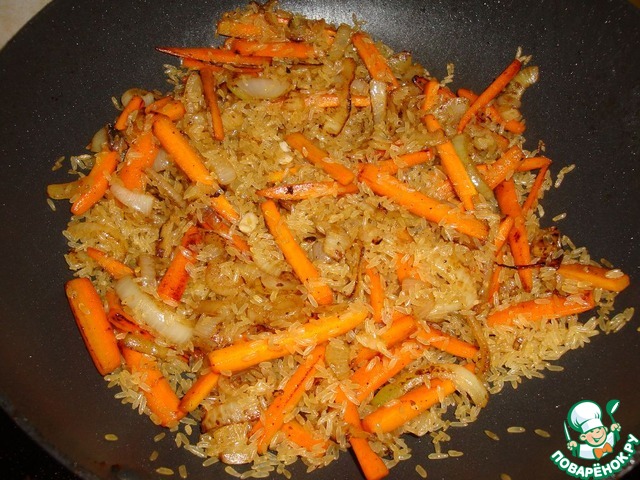 Затем к овощам добавляем рис и прожариваем его несколько минут, постоянно помешивая. Затем наливаем вино. Прожариваем ещё минуты 3, пока не выпарится вино, постоянно помешивая