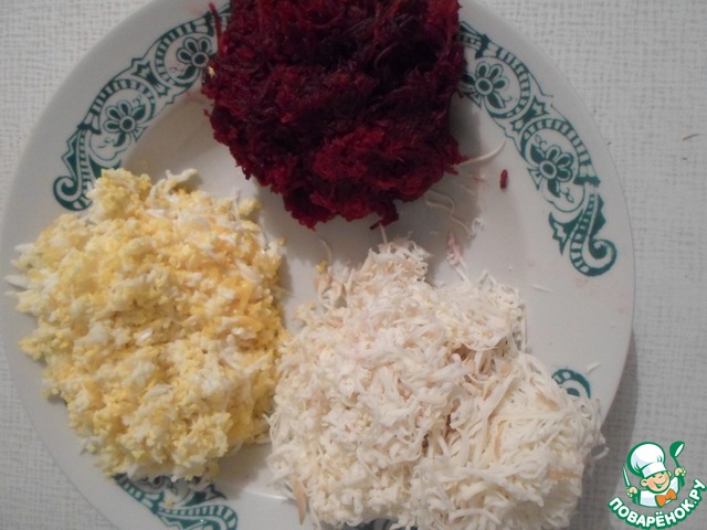 • Свеклу, яйца, сыр натереть на мелкой терке.