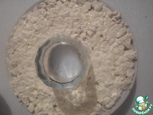 • Начинаем выкладывать слои. Бокал обмазываем маслом ставим вниз горлышком по середине тарелки и выкладываем вокруг него первый слой курицы.