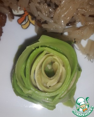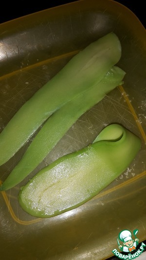 Авокадо чистим, вынимаем косточку и нарезаем полосками специальной овощечисткой.