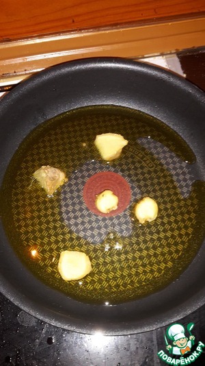 Тем временем на другой сковороде обжариваем имбирь, протертый на терке или порезанный кусочками (чтобы потом можно было его вытащить, если не любите его жевать).
