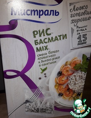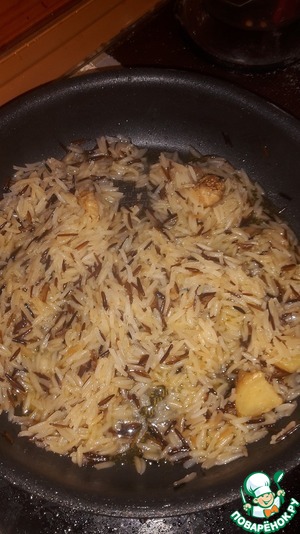 Через пару минут выкладываем на сковороду рис Мистраль Басмати. И немного обжариваем вместе с имбирем или в имбирном масле.