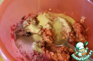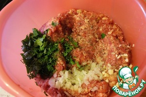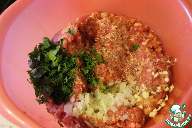 В фарш добавить мелко рубленный лук, чеснок и зелень, посолить и поперчить. Перемешать.