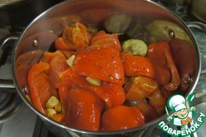 С запеченых помидоров и, по-возможности, с перцев снять кожицу. Переложить овощи в большую кастрюлю, влить вино и довести до кипения. Варить 3 минуты. Если у вас нет вина, не огорчайтесь. Выдавите сок из одного маленького лимона, добавьте бульона или воды до 150 мл и используйте для рецепта.