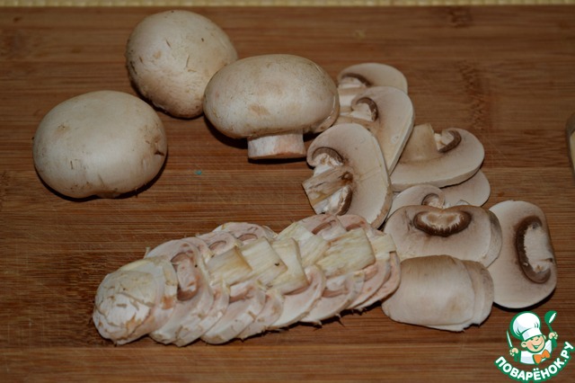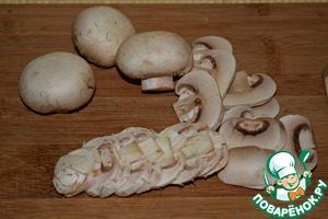Шампиньоны тщательно протереть бумажным полотенцем и нарезать тонкими ломтиками.