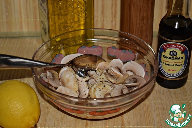 В нарезанные грибы добавить лимонный сок и соевый соус. Я использовала соус ТМ Kikkoman. Оставить мариноваться на 20-25 минут.