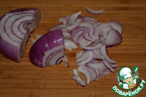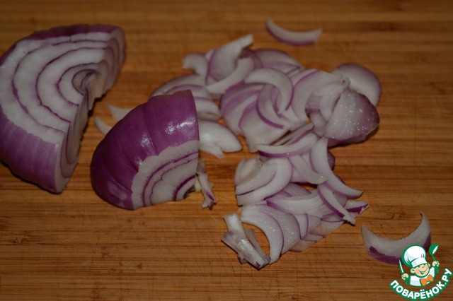 Красную луковицу очистить и порезать тонкими полукольцами.