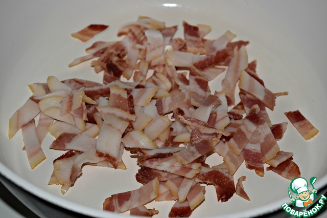 Ломтики бекона нарезать на полоски и вытопить на среднем огне 10 минут. Выложить бекон на бумажное полотенце, чтоб убрать лишний жир.