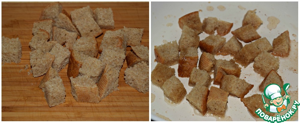 Хлеб (любой белый хлеб) нарезать кубиками и быстро обжарить до золотистой корочки в той же сковороде, где готовился бекон.