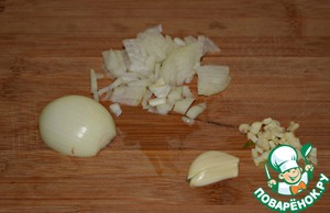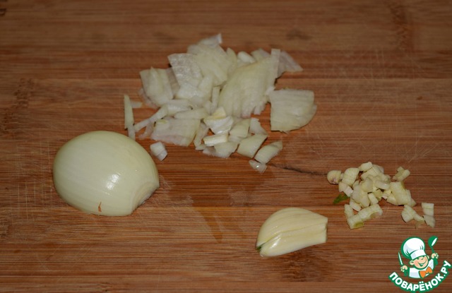 Репчатый лук и зубок чеснока очистить и мелко порезать.