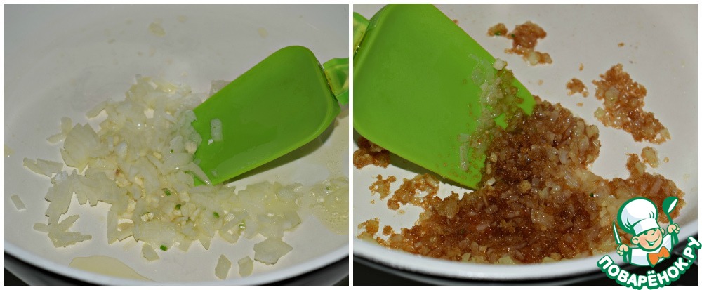 Обжарить на ложке оливкового масла пару минут, добавить коричневый сахар. Хорошо перемешать до растворения сахара.