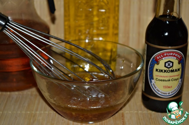 Приготовить заправку. В лук и чеснок с сахаром добавить уксус, оливковое масло и соевый соус. Я использовала соус ТМ Kikkoman. Приправить солью и перцем. Прогреть пару минут и вылить готовую заправку в чашку. Слегка взбить венчиком.