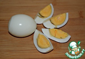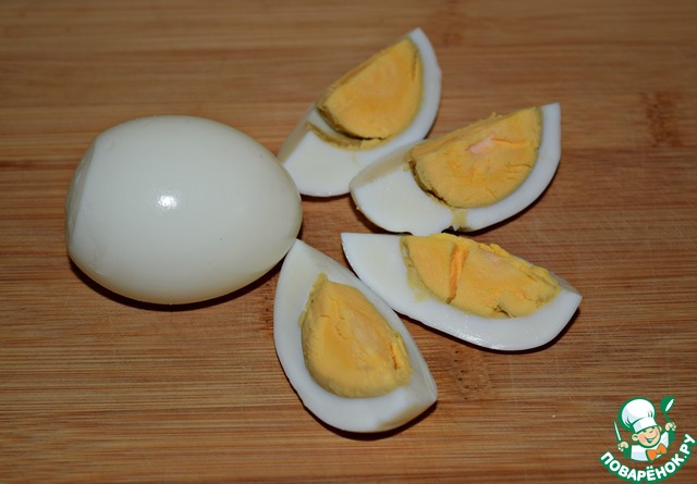 Сваренные яйца очистить и разрезать на четвертинки.