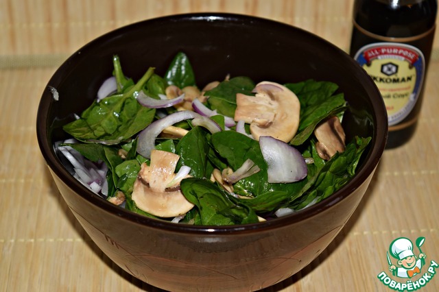 В чашку со шпинатом добавить красный лук, шампиньоны (маринад слить), залить тёплой заправкой и перемешать. Сверху выложить яйца, обжаренные кусочки хлеба и посыпать беконом. Подавать салат тёплым.