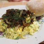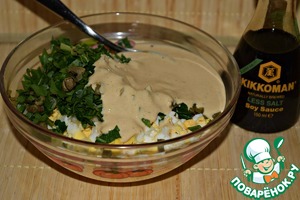 Смешать яйца, порезанный сельдерей, измельчённую зелень и каперсы. Заправить салат смесью йогурта, соевого соуса и карри.