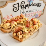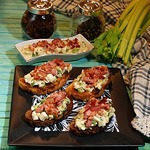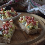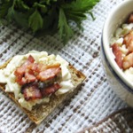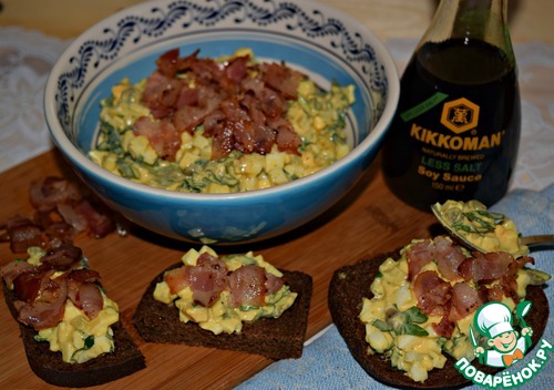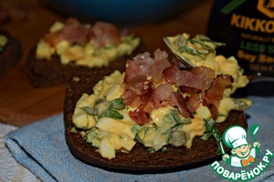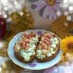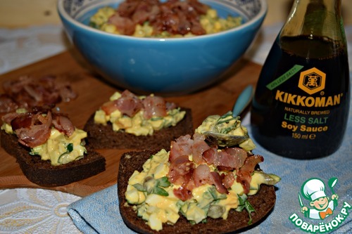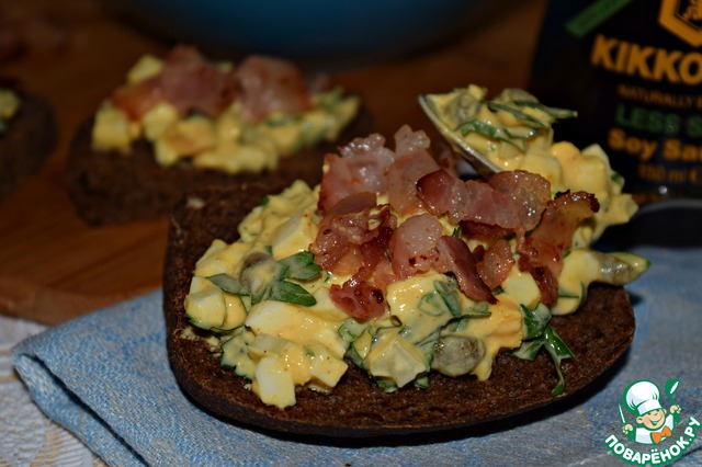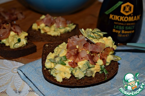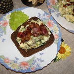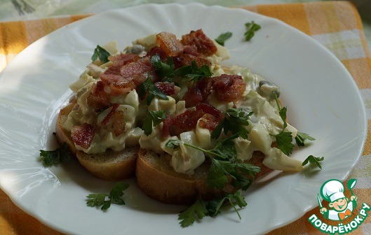 Очень удобно и вкусно подавать такой салат на ломтиках черного хлеба, гренках или тостах, посыпав жареным тёплым беконом.