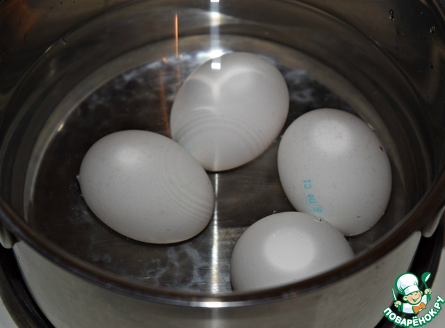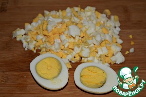Отваренные яйца слегка остудить, очистить и сразу мелко порезать. (горячими)