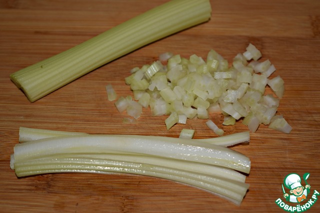 Пока варятся яйца, сельдерей вымыть, при необходимости очистить от жёсткого верхнего слоя, мелко порезать.