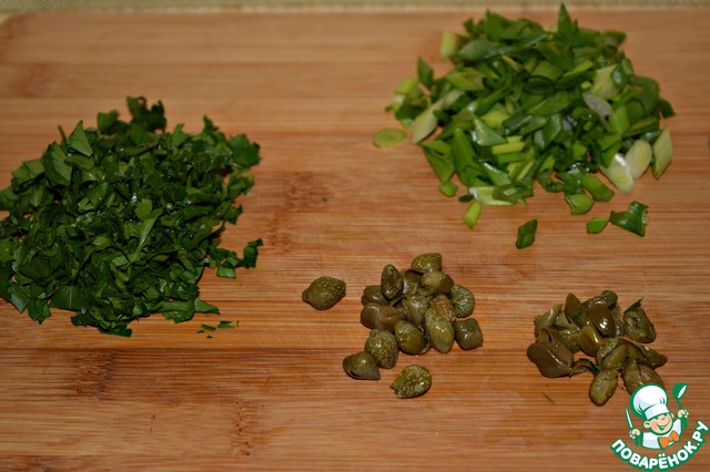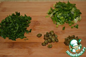 Петрушку, лук измельчить. Каперсы разрезать пополам или на 4 части, если они крупные.