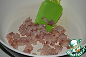 Ломтики бекона нарезать небольшими кусочками, выложить на слегка раскалённую сковороду и жарить минут 5-6.
