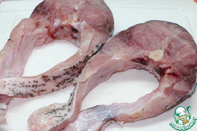 Стейки карпа промыть, обсушить бумажным полотенцем.