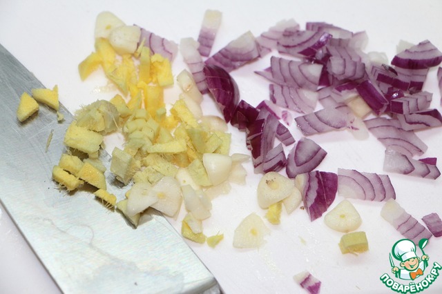 Очистить и нарезать лук, очистить имбирь, порезать его кусочками.