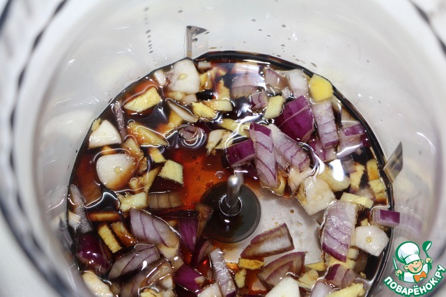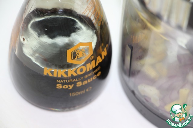 Сложить все компоненты в чашу блендера, влить соевый соус