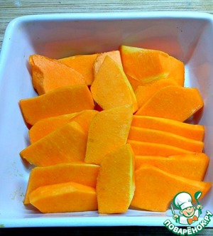 Тыкву вымыть, почистить, нарезать пластинками и уложить в форму для запекания, либо на противень.