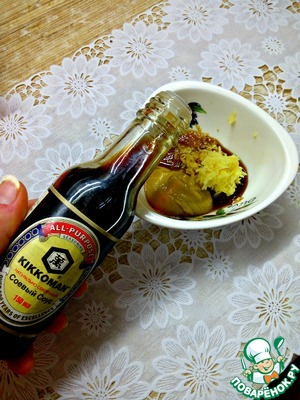Для соуса имбирь натереть на терке, добавить горчицу, сахар, соевый соус и растительное масло. Тщательно смешать.