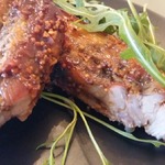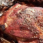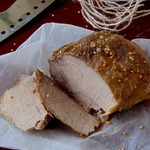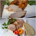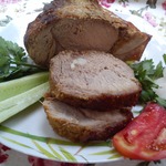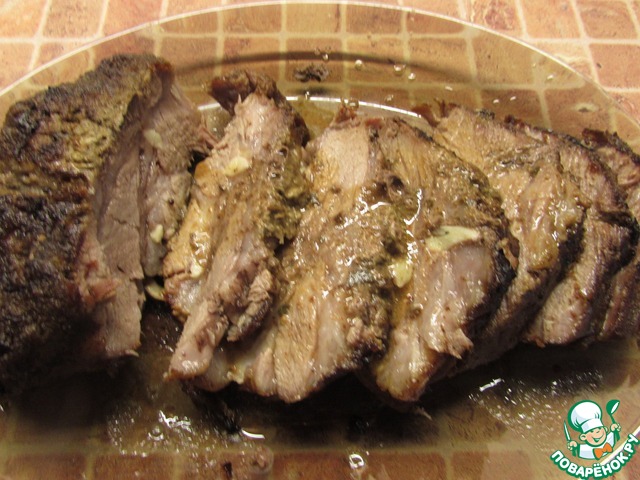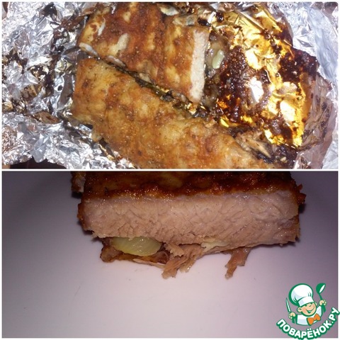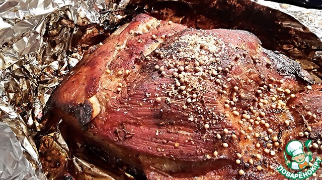 Через час достать грудинку из духовки, снизить температуру до 200-210С, развернуть фольгу (осторожно, горячее) и поставить опять в духовку, чтобы грудинка покрылась аппетитной корочкой.