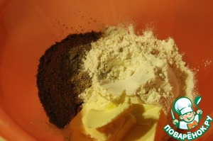 В миске смешать оба вида муки, соль, сахар, добавить охлаждённое масло и перетереть руками в крошку.